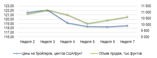Основная "рабочая лошадка" рынка (средняя птица весом 2.51-3.5 фунта) теряет объёмы продаж, но цена растёт. Возможно, предложение этой категории сокращается. Мелкая птица (до 2.5 фунта) относительно стабильна в цене, а продажи растут.